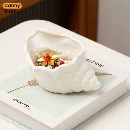 Bring a touch of the ocean to your space with this conch shell-inspired ceramic jewelry dish, perfect for storing jewelry, keys, or small treasures.