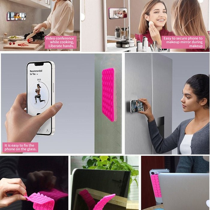 Just press both sides against smooth surfaces—your phone stays secure without any adhesive or magnets.