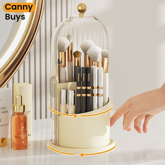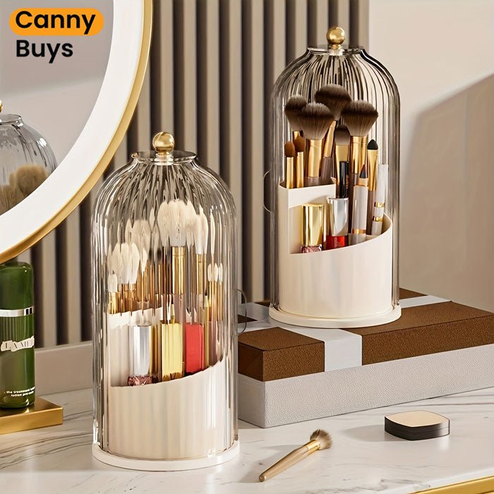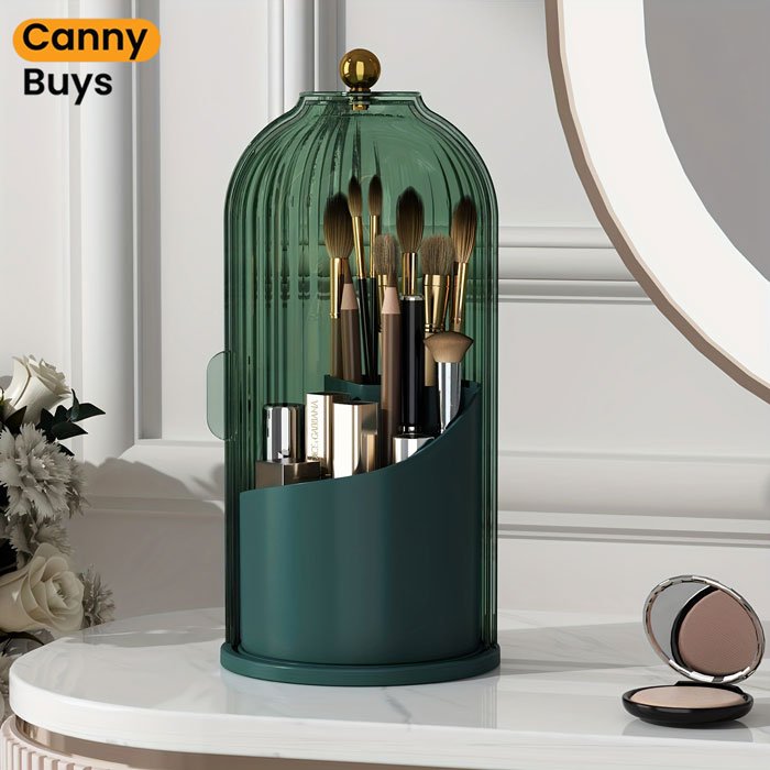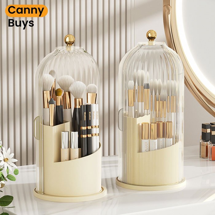 Turn your vanity into a luxury corner! This 360° Rotating Makeup Brush Holder combines style, storage, and smart design. With its birdcage-inspired look and dustproof transparent cover, it’s perfect for organizing all your brushes and cosmetic essentials neatly in one place.