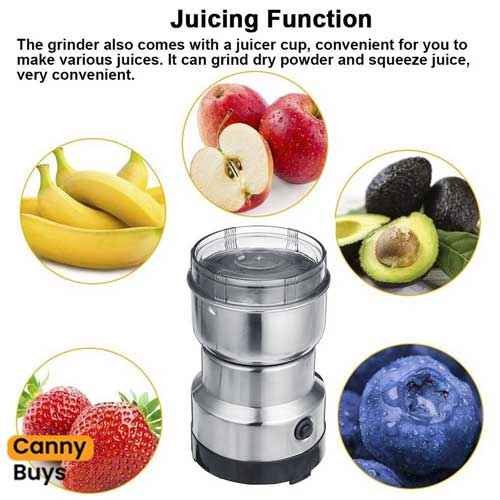 Enjoy the convenience of a dual-function electric grinder that effortlessly grinds coffee beans, spices, and grains while also serving as a juicer for fruits and vegetables. Designed with a high-quality 304 stainless steel body, this durable and efficient kitchen essential simplifies your daily cooking routine.